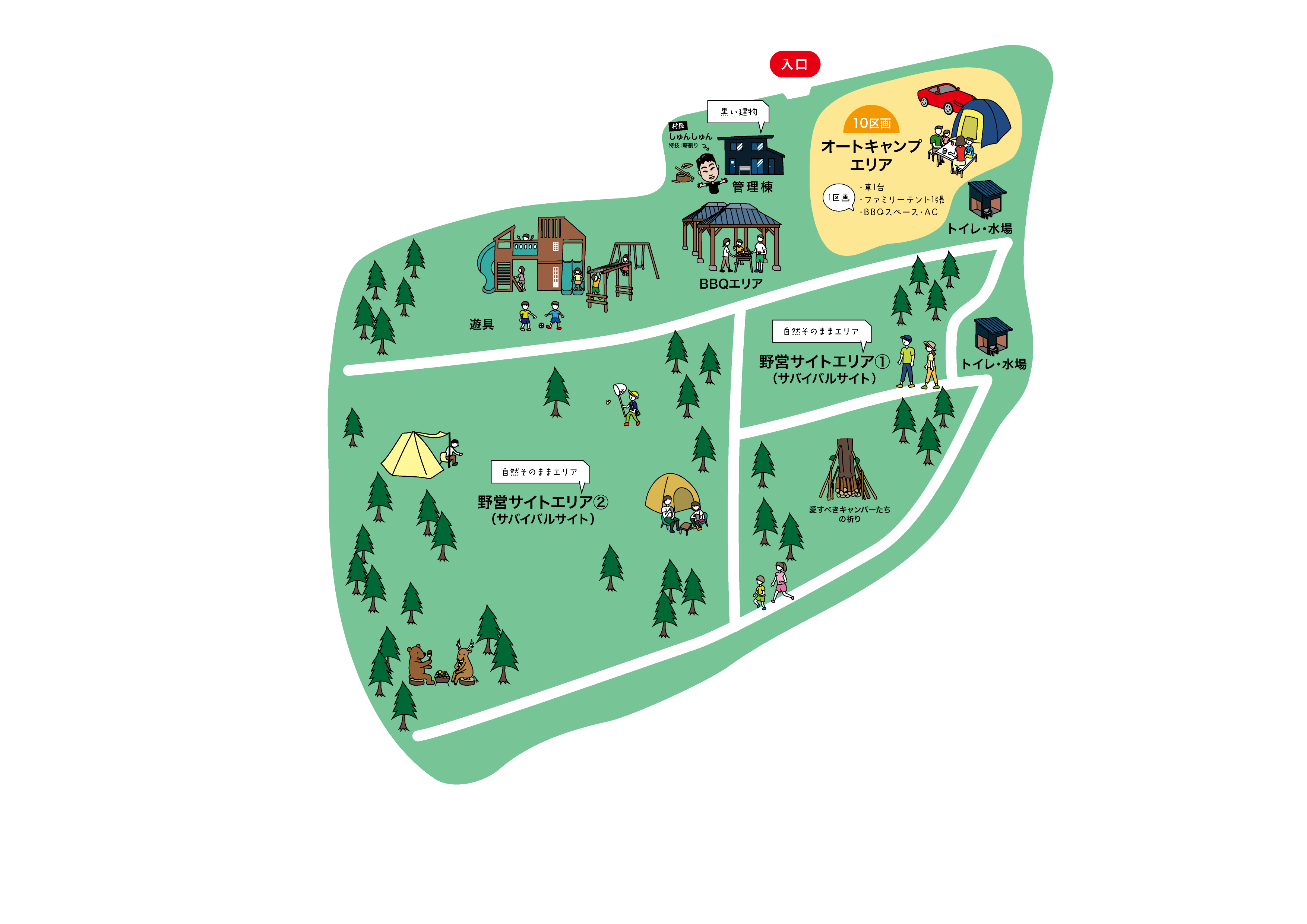 オートキャンプはじめ、フリーサイト、BBQサイトをご用意しています。ソロキャン、グルキャンとしても使用いただけます。デイキャンプ、BBQだけのご利用も大歓迎です。
